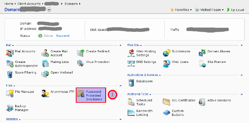 Hierzu ruft man in Plesk die Übersichtsseite für die jeweilige Domain auf und klickt dort auf Password Protected Directories (1):