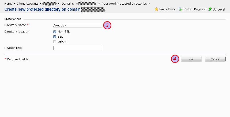 Auf der sich nun öffneten Seite muss das WebDAV-Verzeichnis eingeben werden und zwar relativ zum Order httpdocs der Domain. In unserem Fall muss also /webdav eingetragen werden (3). Dann heißt es nochmal auf OK klicken (3):