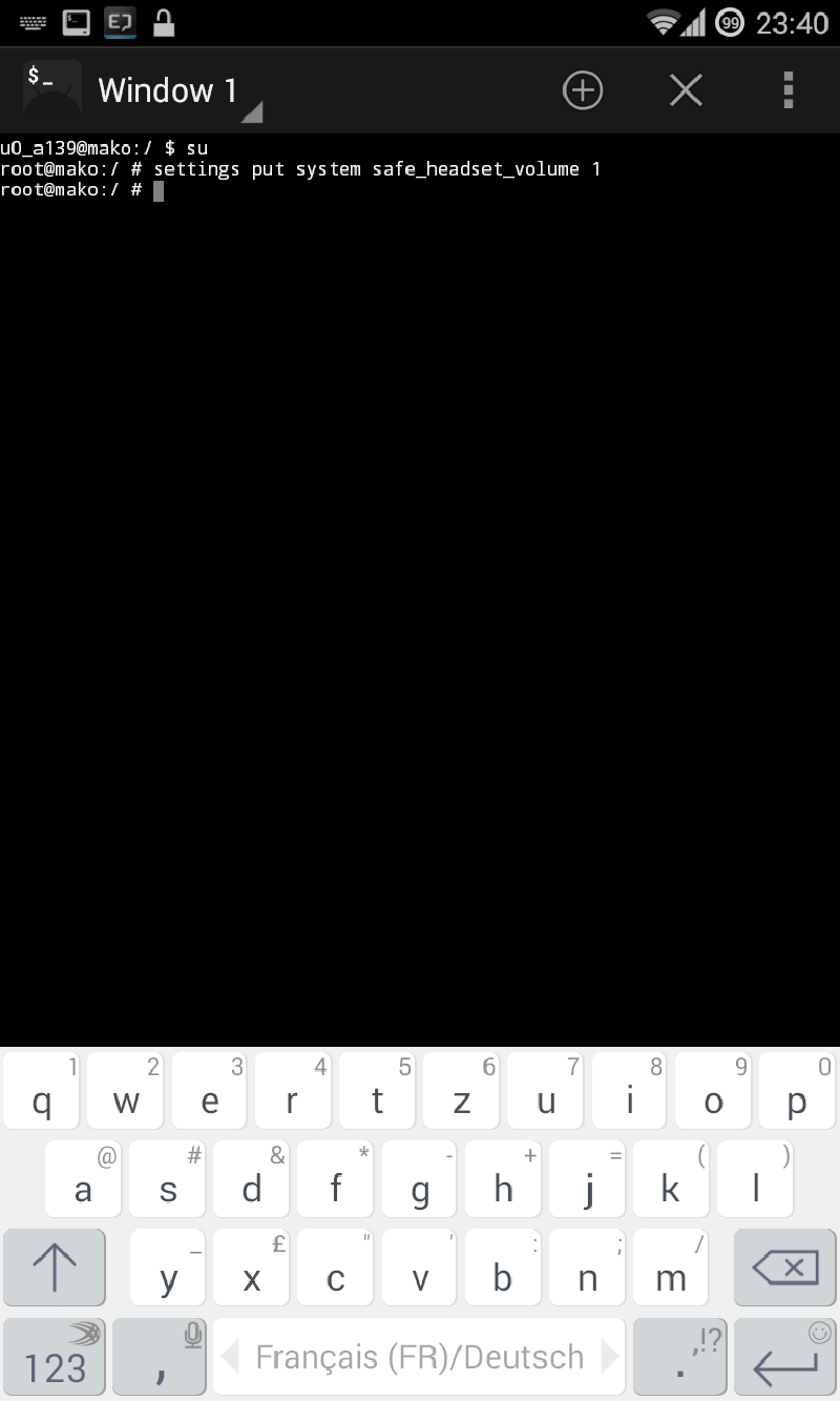 - First you have to install a terminal emulator on your smart phone. I recommend the open source app Terminal Emulator. (Alternativly you can apply the fix via the Android Debug Bridge (ADB), however I will not describe the steps here.)