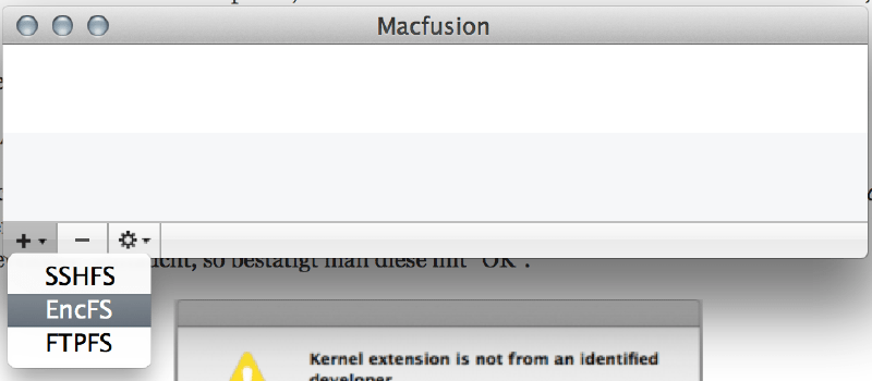 Nun startet man Macfusion und fügt per Klick auf das +-Symbol ein EncFS-Volumne hinzu