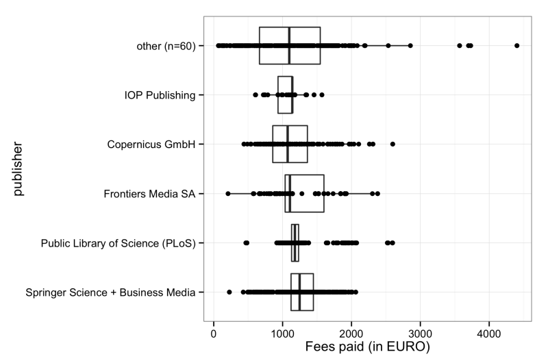 Die gezahlten Publikationsgebühren bewegen sich in einer relativ großen Spanne, von wenigen hundert Euro bis hin zu über 4000€. Durchschnittliche werden knapp 1226€ pro Artikel fällig und die durchschnittlichen Publikationsgebühren der einzelnen Verlage sind relativ nah beieinander.