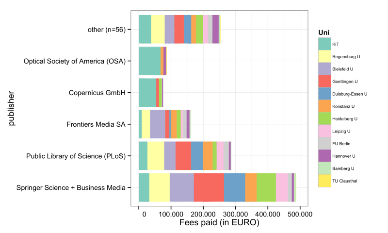 Zudem zeichnet sich ab, dass einige Big Player sich auch das Open Access Geschäft aufteilen könnten: In den OpenAPC-Daten dominiert mit großem Abstand Springer, gefolgt von der Public Library of Science (PLoS). Springer gehört bereits auf dem Markt für klassische wissenschaftliche Zeitschriften zu einem der Marktführer, neben Wiley und Elsevier. Die beiden letzteren Verlage tauchen interessanterweise bisher nicht in nennenswertem Umfang in den Daten auf.