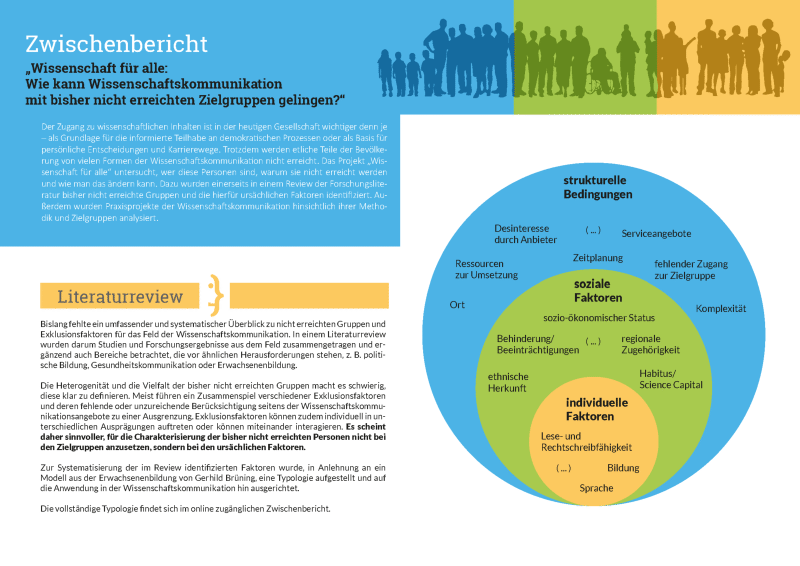 In einem ersten Schritt haben wir uns dazu die bisherige Forschungsliteratur zu nicht erreichten Gruppen angeschaut und zwar nicht nur im Bereich der Wissenschaftskommunikation, sondern auch zu Politischer Bildung bzw. Partizipation, Gesundheitskommunikation, Inklusion, … Also in Bereichen die vor ähnlichen Herausforderungen wie die Wissenschaftskommunikation stehen.